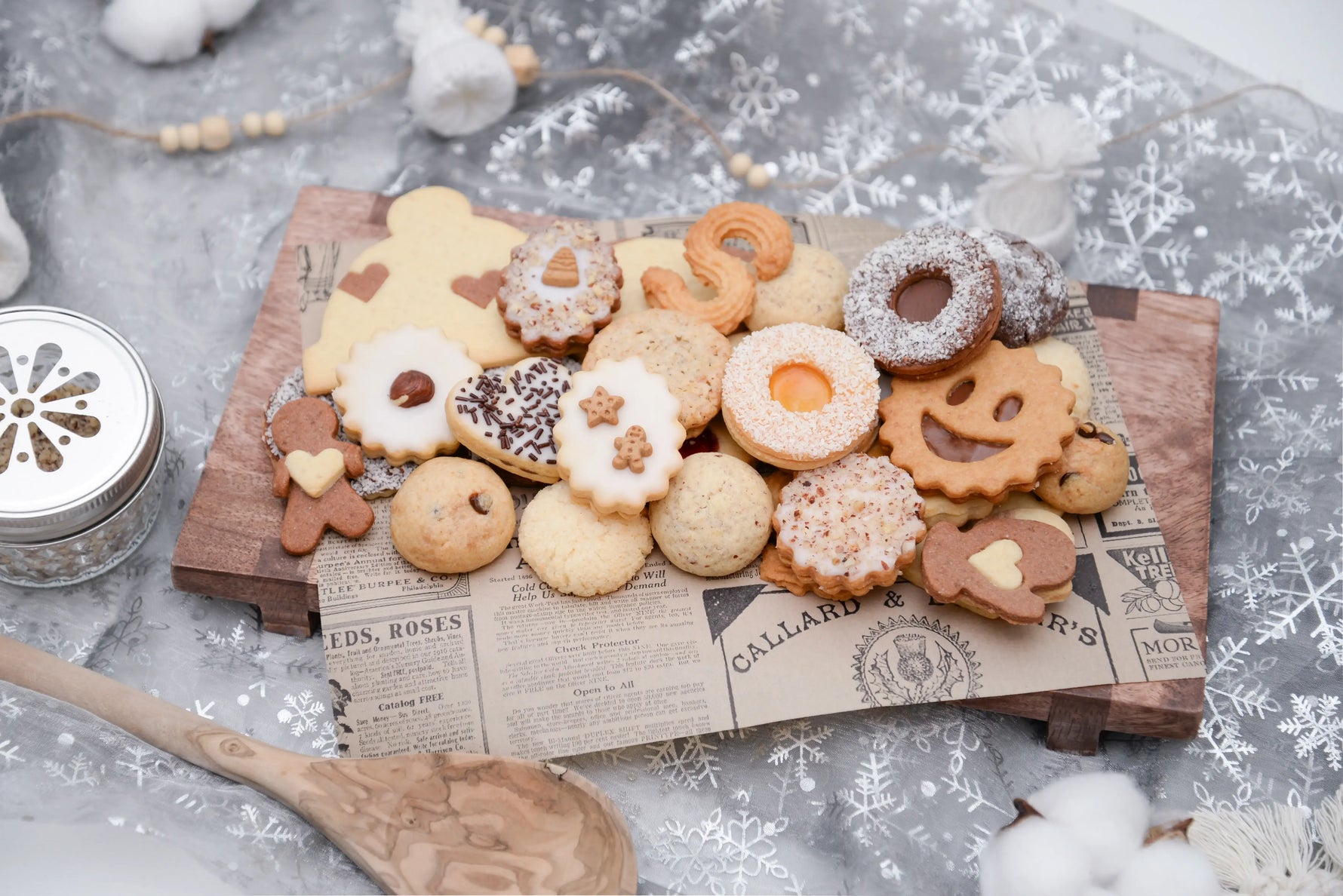 Craquez pour l’assortiment festif de biscuits de Noël vegan avec plus de dix variétés artisanales. Parfait pour offrir, partager ou se faire plaisir pendant les fêtes !